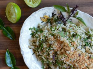 - Add the rice and about 2 tablespoons of the coconut. Toss to combine, then add the fish sauce (or dried shrimp) and lime juice. Toss, wait 5 minutes, then taste. You may need extra salt, pepper, or lime juice. Aim for a balance of all the flavors. The herbs are subtle yet their pungent fragrant selves should shine too. Transfer to a shallow dish or serving bowl, garnish with the reserved coconut.