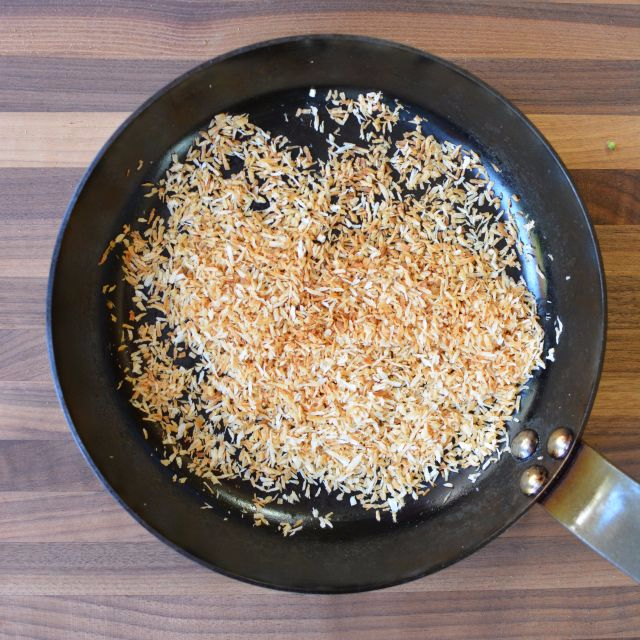 - In a small skillet or saucepan over medium heat, toast the coconut until fragrant and caramel colored, 4 to 5 minutes. Stir frequently to ensure even cooking. Remove from the heat and cool. Cover if you will let it sit for several hours, or its perfume diminishes.
