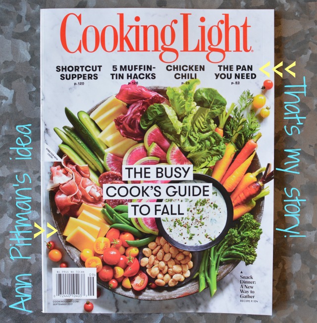 I just noticed that my friend Ann Pittman, Cooking Light executive editor, and I are both on the cover. Hers is the genius idea of a snack tray dinner for busy families.