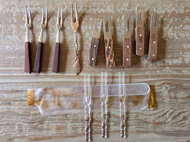 Each cake is meant to be cut into thin slices to be nibbled on with hot tea. My family always ate our moon cakes by picking up the slices. The box from Stacy included a charming set of three plastic forks and a knife for serving and eating. How civilized! I happen to have a strange obsession about little forks for canapes and fruit. My collection is varied and spans 60+ years of design.