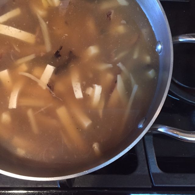 - In a 3- or 4-quart pot, heat the oil over high heat. Add the ginger and cook, stirring frequently, for 1 minute, until the ginger is super fragrant. Add the bamboo shoot (or lily bulbs) and mushrooms, stir for about 15 seconds until you can smell their perfume, then add the stock.