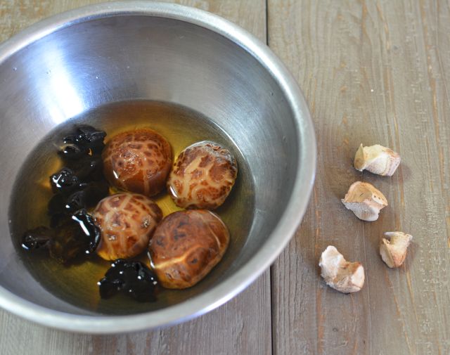 - 4 large dried shiitake mushrooms, or 4 small dried shiitake mushrooms plus 4 or 5 cloud/wood ear mushrooms, soaked, trimmed, and sliced