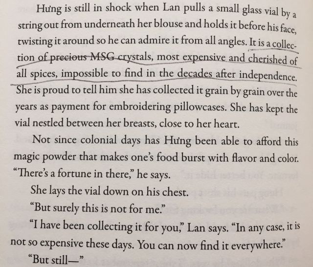 During the Vietnam War, an ingredient like MSG was a luxury in northern Vietnam. Below is a poignant passage from Camilla Gibb's wonderful pho-centric historical novel, The Beauty of the Humanity Movement. Hưng is a humble, very poor pho vendor who stubbornly continued his culinary craft through times of war and peace. Lan is a long-time neighbor who cares for him deeply and their conversation moves from post 1954 to around the early 2000s.