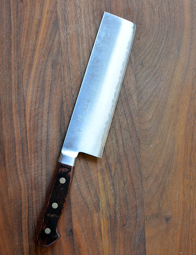 Nakiri - This cleaver-like knife with a straight edge is considered a home cook's vegetable knife but it does pro-level work on the cutting board. This one below, also by Kohetsu and made of HAP40 steel, enables beautiful, slender, matchsticks, thin slices of potatoes for au gratin dishes for (forget a mandoline!), and perfect dice. How do I get super thin slices of onion for pho? The nakiri you see here: