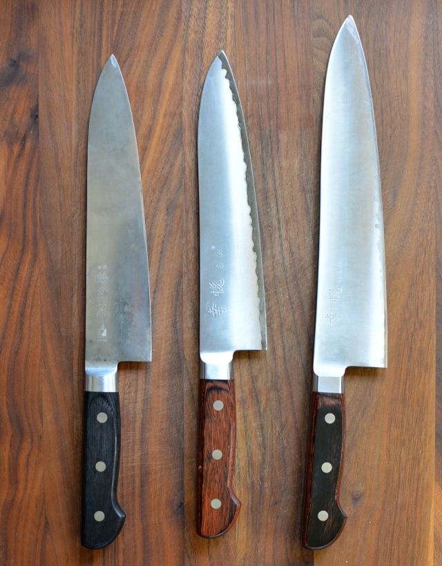 On the far left is the Kanahide TK gyuto 210 mm (8.2 inches long) made of semi-stainless steel, a great value steel that gets a little spotty and stained over time. That's just cosmetic. It does not keep its edge as well as the stainless steel-clad carbon steel knife in the middle, the Kohetsu Gyuto Super Aogami 210 mm. The exposed edge of carbon steel darkens and ages beautifully over time. I tried that steel because the RHc was 64. The semi-stainless came in at about 61 on the RHc scale. You can see where I'm going here...