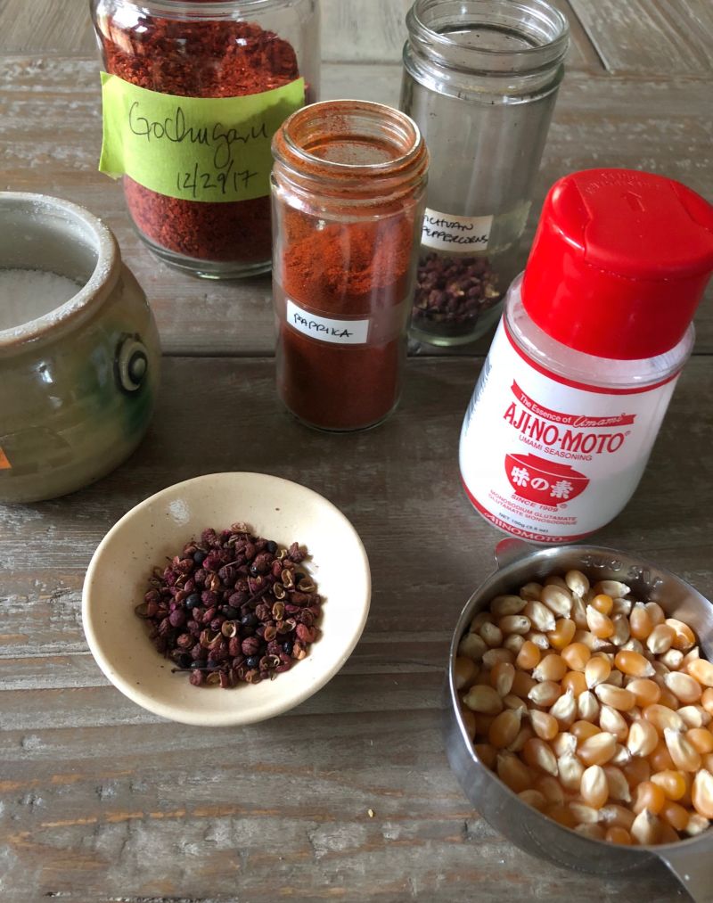 By the time I got the recipe in November 2017, the peanuts were out of the picture. Andrew was focused on creating a spicy, numbing Sichuan version of Doritos done up with popcorn. That's my description after making the first batch. It needed work, but I was intrigued by Andrew's combination of seasonings. I burned a few batches trying to get the seasonings to stick while the popcorn was popping in the pot (don't try that at home).