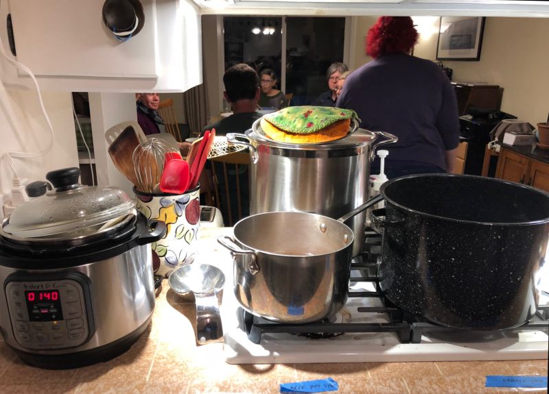 Surprise! Everyone was very friendly. I had to nose around to see what was going on. There were 4 kinds of broths to try! Two were simmered slowly in a stockpot by Kristin and Eric and the other two were made in the Instant Pot by Deb, David, Julianne, and Gerald. Deb proudly showed me the gorgeous Thai chiles she'd purchased from the Chinese market, to boot!