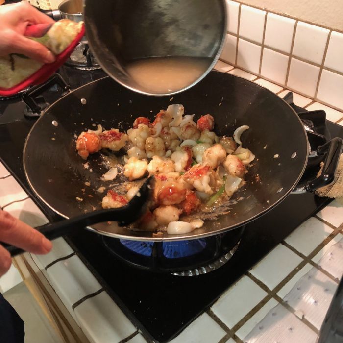 - Return the lobster to the pan. Stir-fry to heat through, 1 to 2 minutes. Give the seasoned stock a stir, then pour into the wok. Stir to combine. When things start bubbling soon, add the remaining green onion sections. Cook until barely or just wilted then remove from the heat. Transfer to a plate and serve immediately.