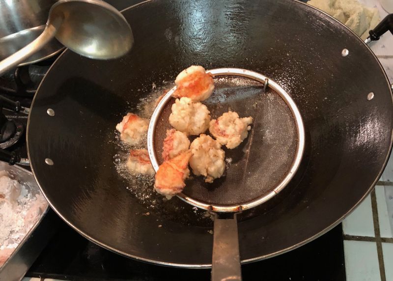 - Pour enough oil into a large wok to a depth of 1 inch; you'll need about 1 ¼ cups. Heat over medium-high heat to roughly 375F. In 2 or 3 batches, fry the lobster pieces, gently dropping each into the hot oil. Fry for 45 to 60 seconds, until crisp. Use a ladle to agitate and coat the lobster with oil. It will not brown. The coating will look clear; don't expect browning. Use a spider or slotted spoon to remove the lobster from the oil and deposit on paper towel to drain. The fried lobster can sit for about 20 minutes, partially covered, if needed to prevent drying.