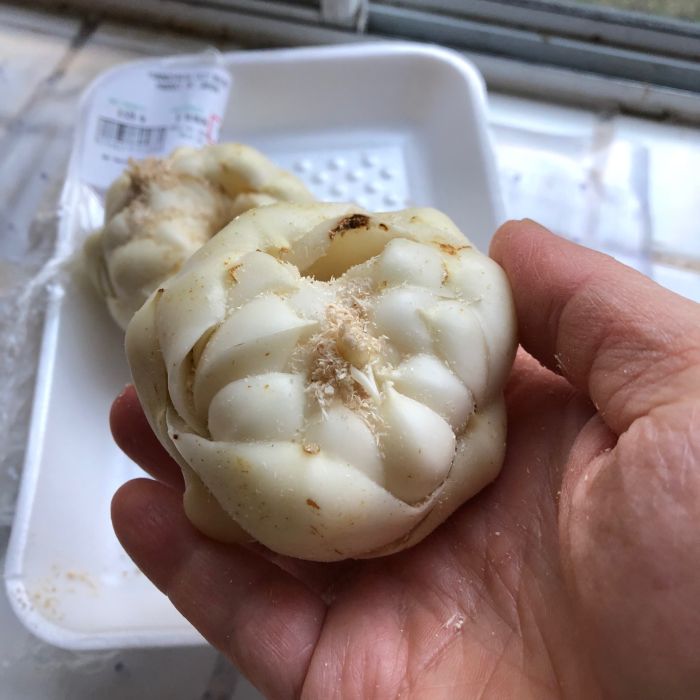 Lily bulbs look like unusual heads of peeled garlic but when you open them up, you realize that they are shaped as petal-shaped pieces. There's dirt stuck inside so a good washing is necessary. I use a paring knife to scrape away super dark spots but they were not a big deal. More on edible lily bulbs can be found at Red Cooking.
