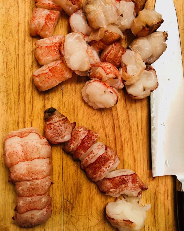 For that reason, the menu was decidedly seafood centric. With Valentine's Day happening last week, too, I scored gorgeous lobster tails at Costco. The Seafood Roadshow guy told me that six of them would equal roughly 1 ½ pounds. I asked him to select big ones since they'll have more meat, plus the prep work remains the same. My aim was to make a Cantonese-style lobster stir-fry.