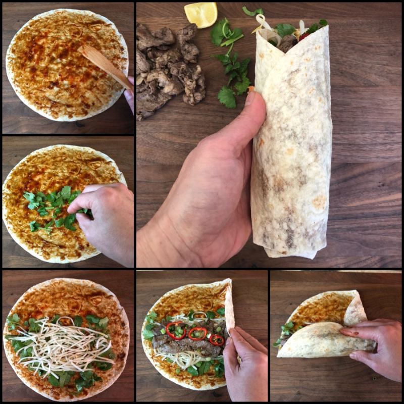 - Spread about 1 ½ tablespoons of hoisin sauce to cover most of the tortilla. Smear on a little chile sauce if you like. Sprinkle about ½ cup herbs in the lower half of the tortilla. Top with ⅓ cup bean sprouts. Add a quarter of the noodles. Add a little hot sauce and/or hoisin, if you like. Then top with a quarter of the beef, a shower of green onions, and some fresh chile.