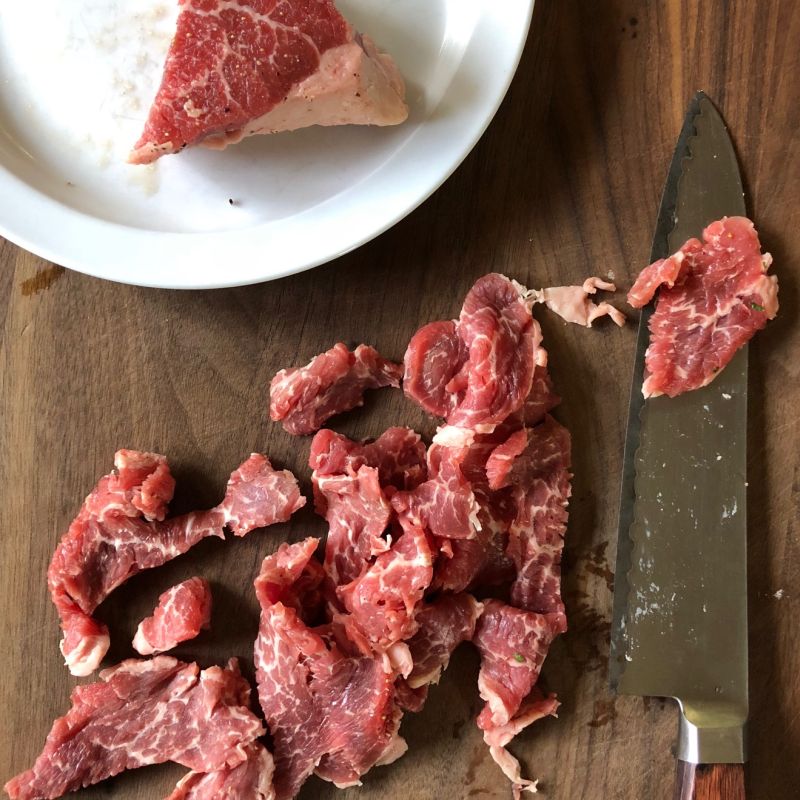 - Heat a large (12-inch) skillet over medium-high or high heat. Swirl in the oil (or fat). Add the seasoned beef, spreading it out. Let cook, undisturbed, for about 1 minute, until it starts browning. Then use a spatula to vigorously stir and move the beef around to stir-fry. Cook for 2 to 3 minutes, until just cooked through. Add ⅓ cup of onion, stir, and when it softens, turn off the heat. Transfer to plate to hold and cool.