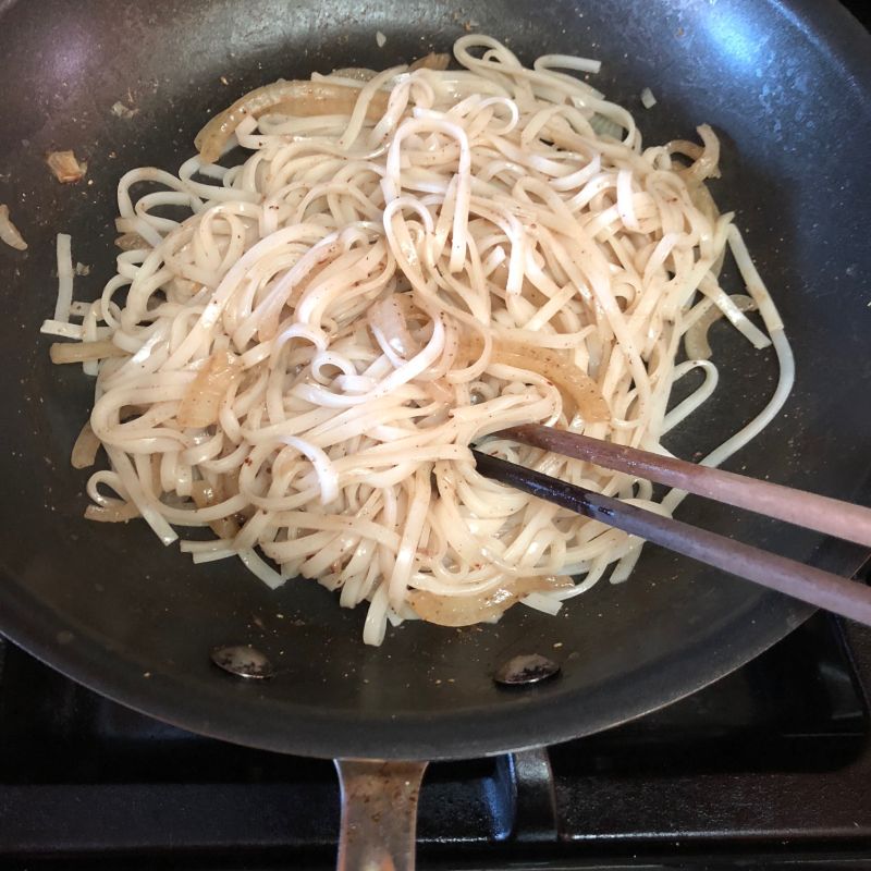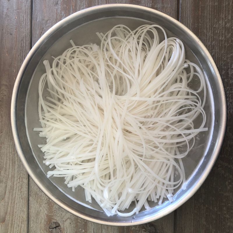- Put the rice noodles in a bowl and add hot tap water to cover. Let sit for about 15 minutes, until opaque and soft. Then drain and set aside.
