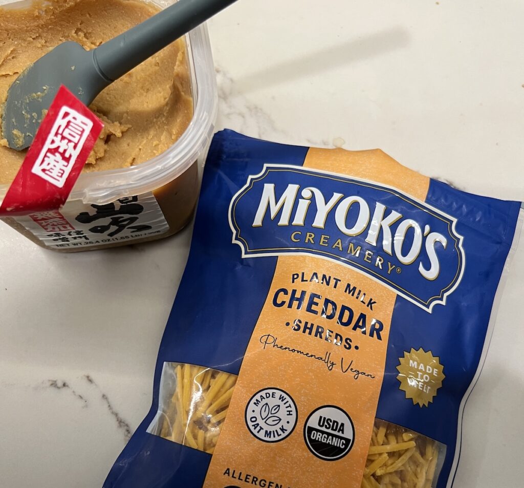 - Mix in 1 ½ to 2 tablespoons of white (shiro) miso (plant-based cheese often tastes mild)
