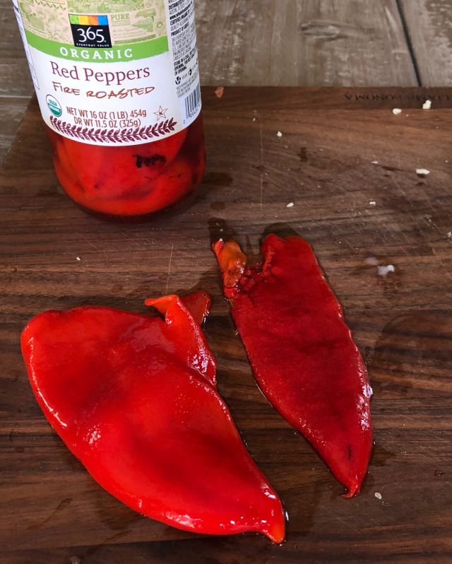 I also had a jar of WF fire roasted red peppers -- which turned out to not be made from regular red bell peppers but rather from slender Hatch or Anaheim-style peppers. The peppers' thin, sweet flesh was super easy to finely chop. Regular red bells are fine but they don't have as intense of a pimento flavor and color as these. Of course, you can use the regular jarred pimento but they don't seem to have much flavor to me. Your choice. You could char and peel the peppers for the most excellent sweet, gently smoky results.