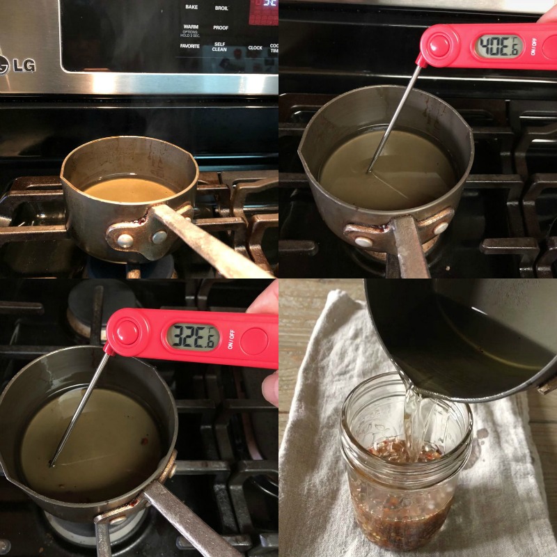 The method. All you have to do is heat the oil until it's very hot and just starting to smoke. That's when it's around 400F! Then you slide the pan to a cool burner and let it cool for 3 to 4 minutes to where it's between 325 to 340F. Then you carefully pour the hot oil into a heatproof container that contains the chile. Then leave it to cool and develop flavor. It's as simple as that.