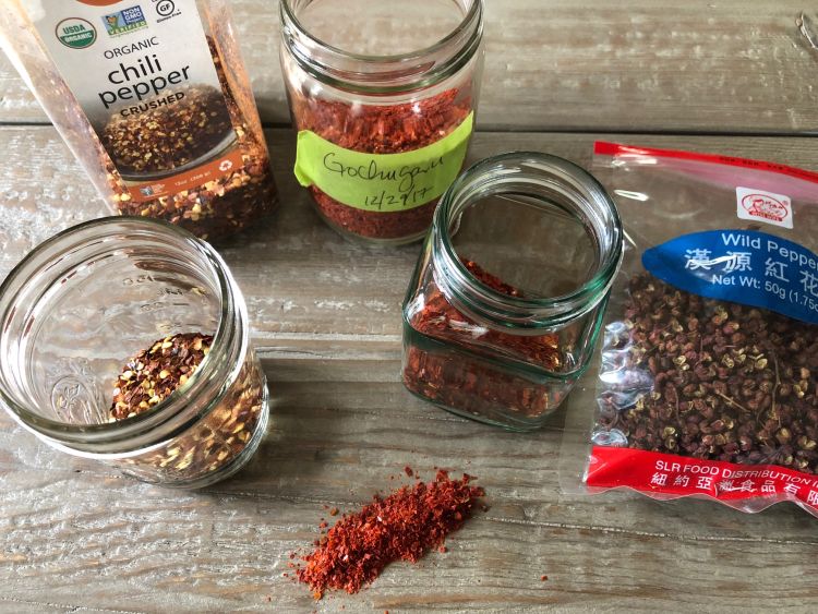Chile options for heat. The large container of chile flakes came from Costco! But if you want a more robust red color, add Korean gochugaru chile flakes, available at Korean markets. You could use another chile, too.