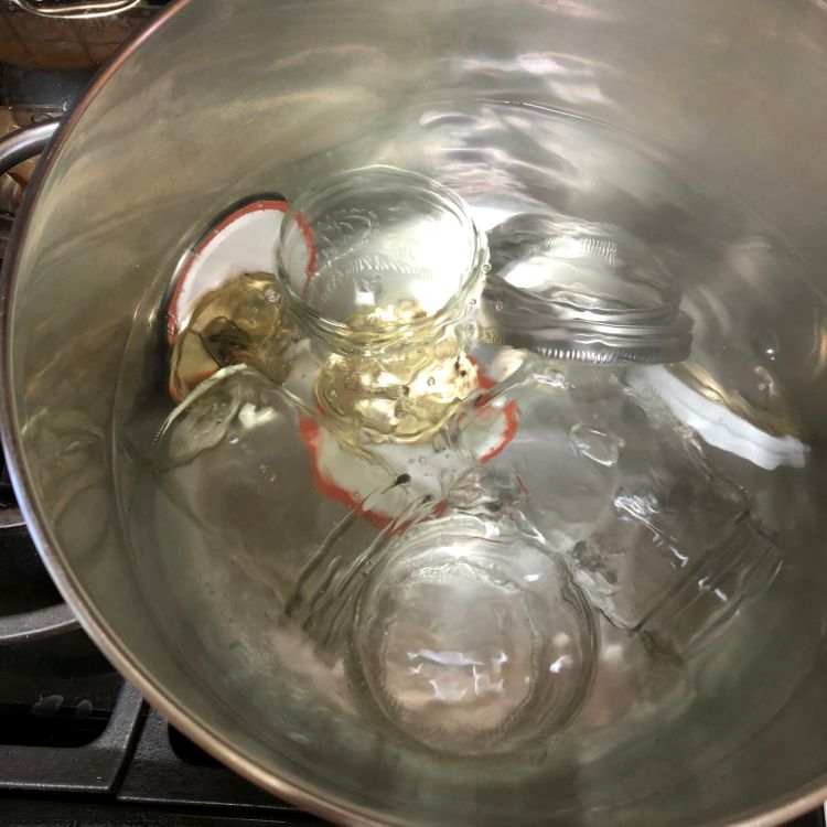 - Bring the water bath back to a boil. If the jars have cooled, warm them in the water bath or in a 200°F oven. Simmer the lids in a saucepan of hot water. Place the jars on the baking sheets.