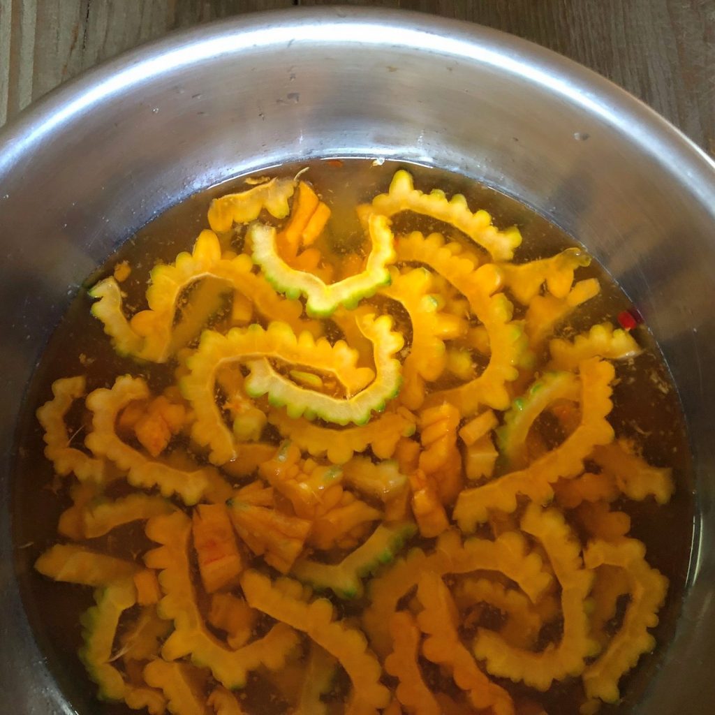 Once halved, cored and sliced, bitter melon reveals it beautiful profile. I take a 2-step approach to reducing the bitterness - first soak the sliced bitter melon in water. Then, if needed, salt the slices. Bitter melon is a member of the cucumber family so you can treat it like one. I've seen bitter melon salads but haven't progressed to them, yet!