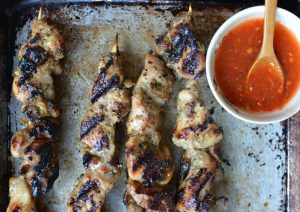 When skewering meat, try to cover most of the skewer. That approach means you can (1) prevent a bamboo skewer from scorching, and (2) the meat stays succulent. After threading the meat on, give the meat a gently squeeze to make sure it hugs the skewers.