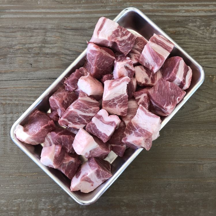 - 1 ¾ pounds | 800g pork belly (including fat and skin) or fatty pork shoulder, cut in sections approximately 1 inch wide and 2 inches (5cm) long