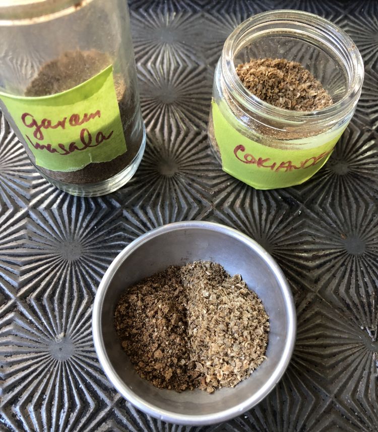 The hang lay powder (a spice blend) is complicated but tucked into its lengthy description was Bush's substitute formula: 1 + 1 - and equal volume of garam masala and ground coriander. So for the 1 tablespoon, I just combined spices from my pantry.