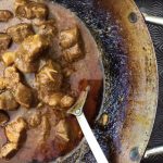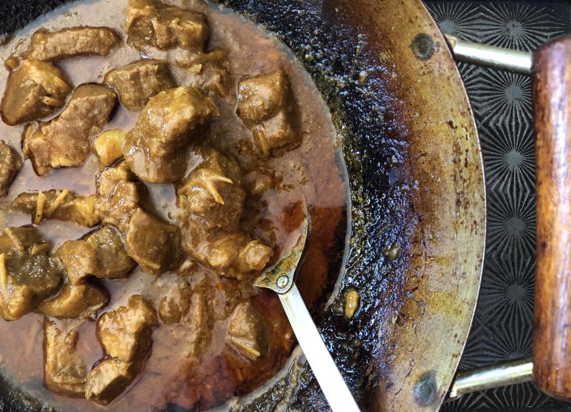 - Using a spoon, mash the tamarind pulp again and strain the liquid through a sieve directly into the pork mixture, pressing to extract as much liquid as possible, discarding the solids. (You can opt to strain the tamarind into a cup or bowl, then pour into the wok.) Simmer, uncovered, until the pork is tender but not yet falling apart, another 10 to 20 minutes.