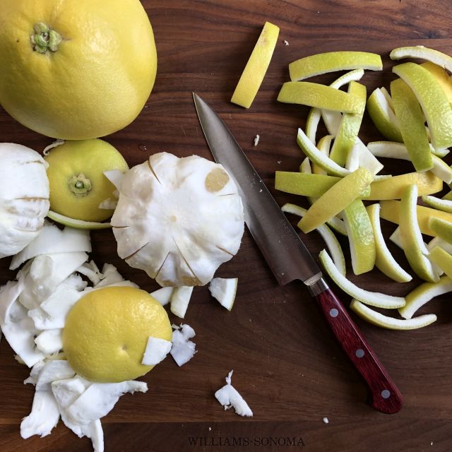 - Use a sharp paring or petty knife to trim ½ inch from both ends of each grapefruit or pomelo. Reveal some flesh to make removing the peel easier. Then make cuts, from top to bottom and at 1-inch intervals, around each fruit. Make sure the knife goes through the peel and pith down to the flesh. Use your fingers to remove the peel in beautiful, discreet sections.