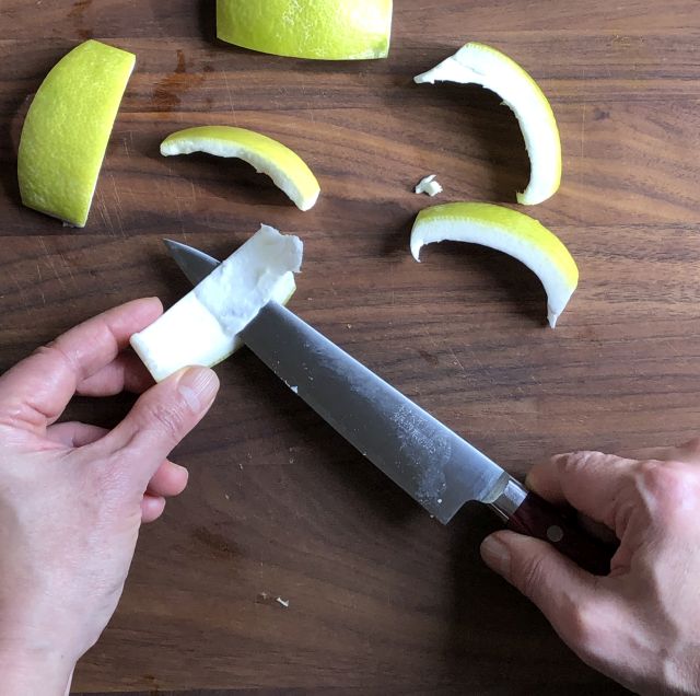 - If the pith is thicker than ¼ inch, wield the knife in a horizontal sawing motion to trim away excess pith from each section of peel. When done, cut each section lengthwise into ⅓ to ½-inch-wide strips.