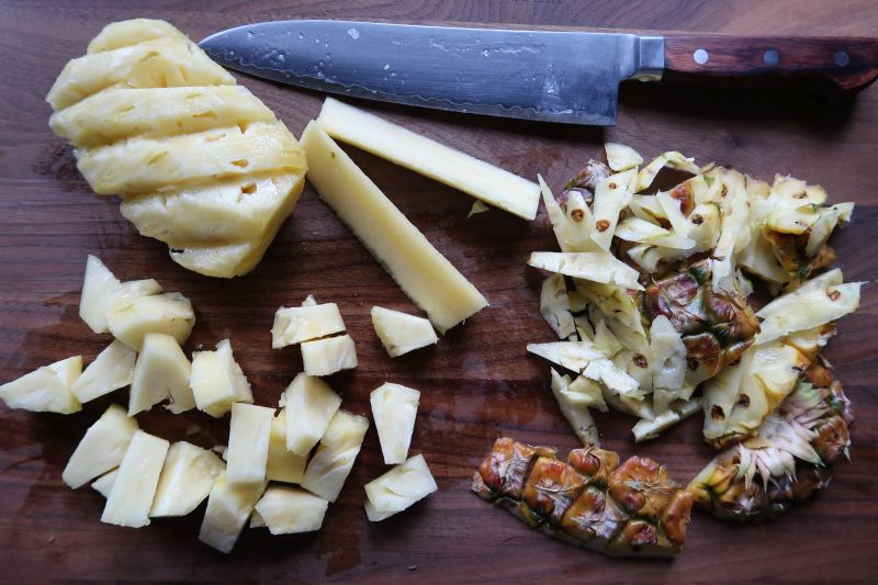 For the pineapple, if possible, use fresh, or as a second choice, use frozen. Avoid the canned variety. A primer on cutting pineapple with little waste is here.