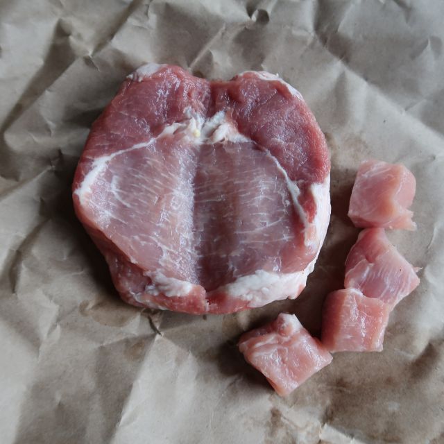 - 1 pound boneless loin pork chops, fatty kind preferred, each about 1 inch thick, cut into 1-inch pieces