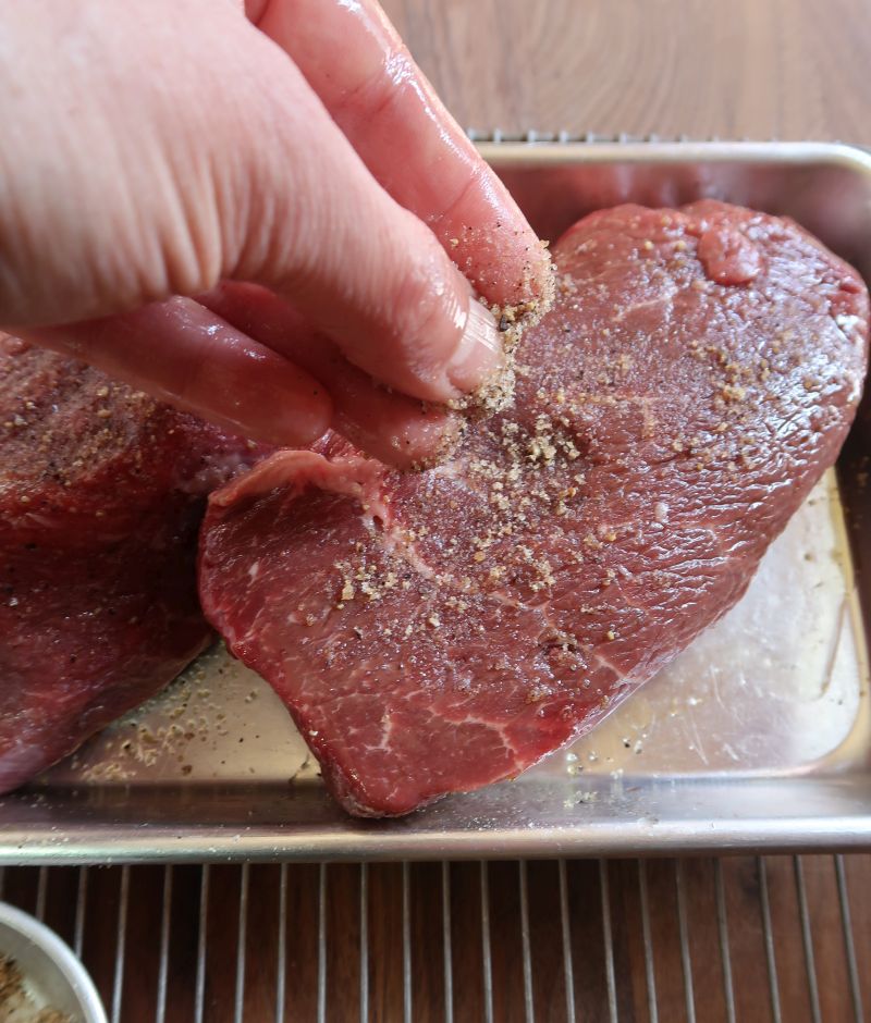 To find out, I did a side by side test on beef top sirloin. I got Prime steaks cut from the cap (more tender) portion of the sirloin at Costco. You can find this cut at Whole Foods and elsewhere. Or, just use your favorite steak. Make sure it's at least 1 inch thick. Mine were about 1 ½ inches thick and trimmed of fat.