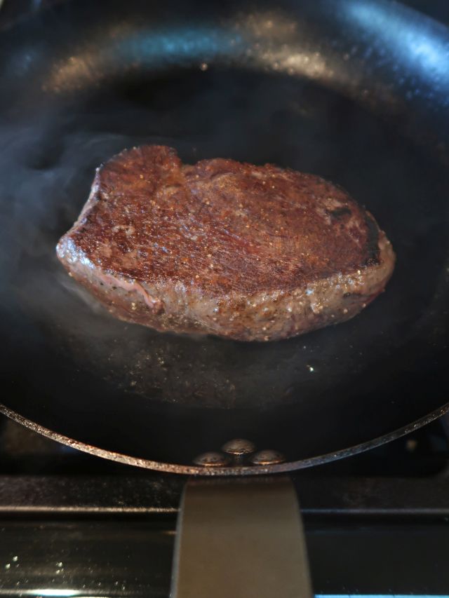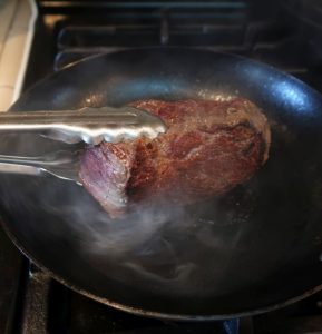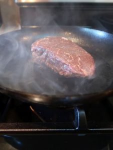 When it came time to cook, I selected carbon steel skillet because I needed something that would get ripping hot. I fired it up and also turned on the exhaust fan to high. Plus I opened the nearby kitchen window.
