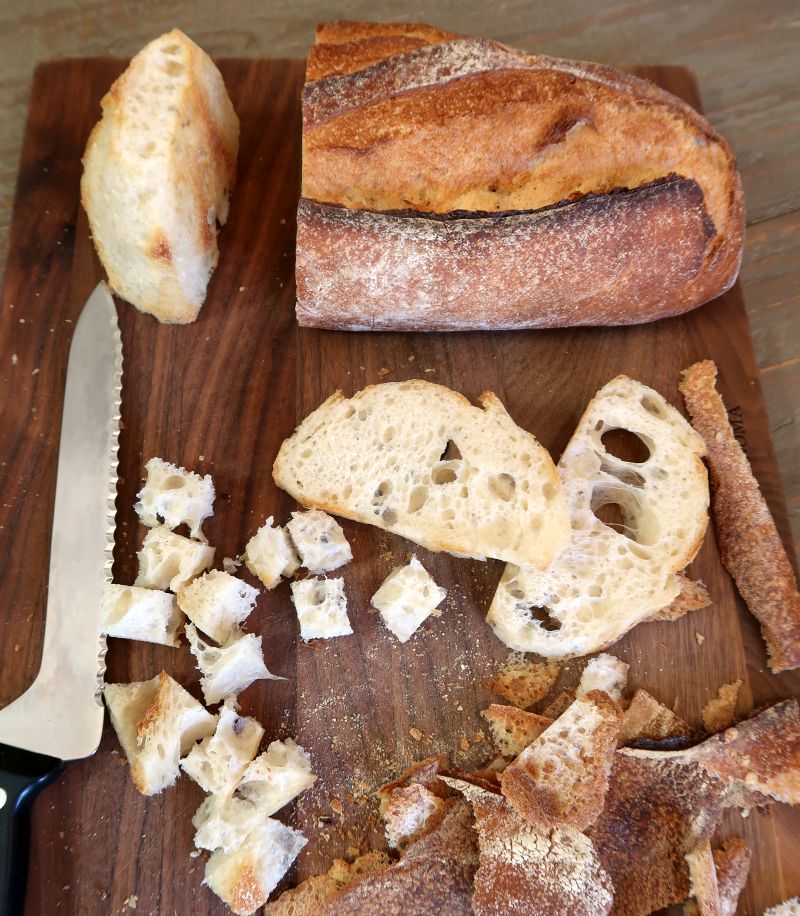 A light and airy bread works well because the croutons don't bake up so dense and hard that they threaten to hurt your mouth. I type from experience because for this round of the salad, I chose a gorgeous rustic sourdough batard for the croutons. Alas, they were very hard and scraped the roof of my mouth.