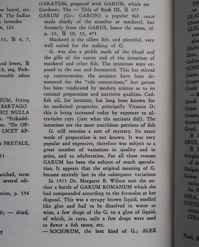 So glad you asked! Garum is spiced fish sauce that was prized by the ancients during Roman times. There are historic recipes online that call for boiling fish with spices and dried herbs plus some vinegar but garum was also a fermented fish-based condiment. The original version was likely from the garus fish, hence the garum name, but things changed and got murky by the fifth century.