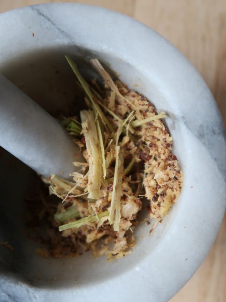 - Use a mortar and pestle to crush one spice at a time, starting with the cloves then working down to the nutmeg. Add the garlic and pound on it to crush it. Then add the ginger and finish with the lemongrass. Transfer the heady mixture to the blender. (If your mortar and pestle is small, do this in stages and add crushed ingredients to the blender.)
