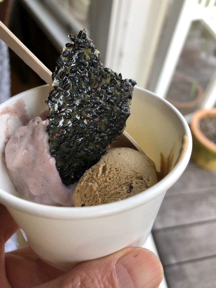 Bebe mistakenly burnt the first batch of cashew sesame brittle (VFAD, page 217) and was out of cashews, so she used a brimming ½ cup of black sesame seeds instead. It tasted fantastic with the Viet coffee ice cream and red bean and coconut ice cream that Pat, another member, made!