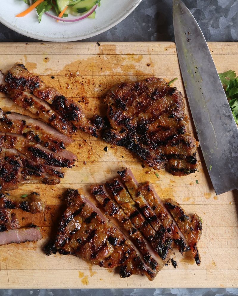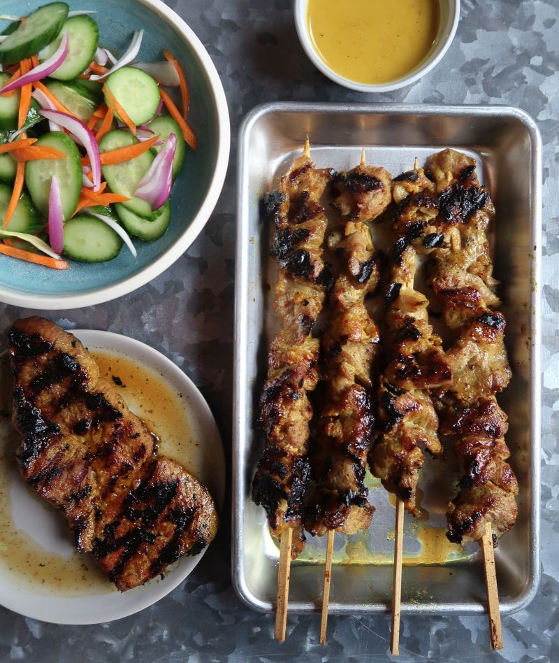 - When ready to grill, heat a grill until it's very hot. Brush the pork lightly with oil, then grill for about 2 to 3 minutes per side for satays (4 to 5 minutes per side for steaks). After the pork loses its pinkness, brush on some of the reserved marinade to coax deep caramelization and charring. As needed, knock off the darkened bits stuck to the grill. Discard any leftover marinade that the pork was submerged in.