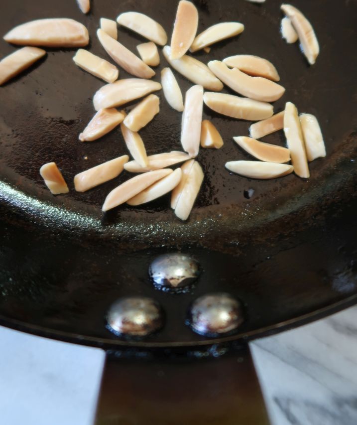 - In a large heavy nonstick skillet over medium heat, toast the almonds, stirring for about 2 minutes until lightly browned and fragrant. Transfer to a plate and set aside.