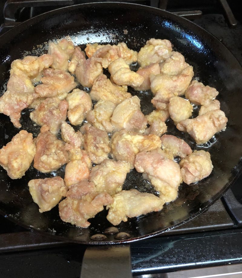 The original recipe called for 2 pounds of chicken thighs to serve 4 people. Once I cut up a pound of the chicken, it yielded a lot, and we're not big meat eaters. Given that, I fried a generous half batch of chicken but kept the sauce quantity the same, to hedge on flavors.