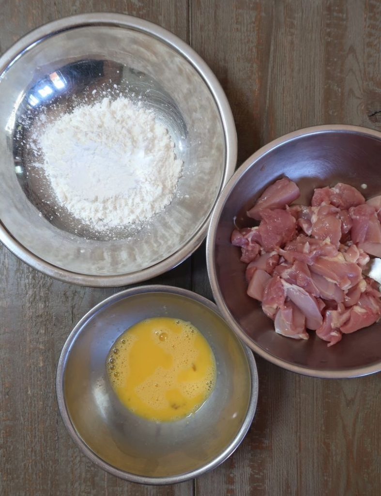 - Add the chicken to the bowl with the beaten egg and toss to coat. Using a spider or large slotted spoon, lift the chicken from the egg and let any excess drip back into the bowl. Toss the chicken in the cornstarch to coat, shake off any excess cornstarch, and set aside.