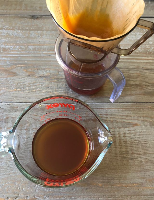 - If you want a clear liquid, let the condiment sit for a few hours then decant to a jar or bottle. Use a coffee filter for super clear results. Store in the fridge and bring to room temperature before using.