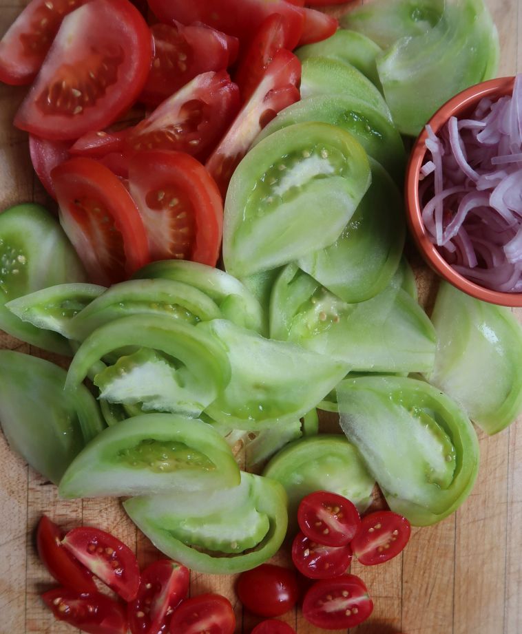 That said, using all green tomato for this Burmese salad resulted in an overly firm, one dimensional dish. Burmese food is subtly layered with flavors. So in my second go at the green tomato salad, I combined one huge unripe beefsteak tomato with a very firm red tomato and a few cherry tomatoes. My aim was to build extra textures and colors.