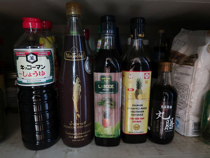 With fish sauce that I don't use as often, such as Megachef Brown label Fish Sauce, blended for Thai cooking -- I keep those in the pantry/closet, which is dark and cool in our Northern California climate. Note the vegetarian fish sauces in there too. They have a preservative. As you can see here, my pantry/closet is dark.