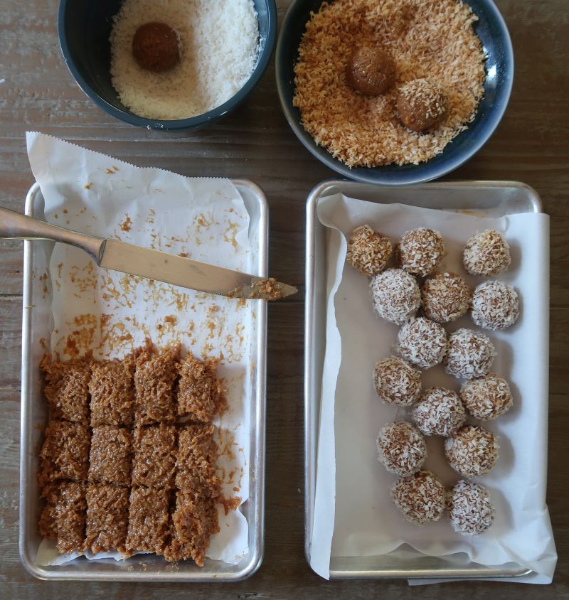 - Meanwhile, put the remaining ½ cup (40g) dried coconut in shallow dish. (If you like, first toast the coconut in a dry skillet over medium heat until lightly browned.) When the fudge is cool enough to handle, use a knife to cut the fudge into a grid of 24 to 30 pieces. Working in batches, use your hands to roll up the pieces into balls, dropping them into the coconut and turning to coat. Arrange the fudge pieces on a plate or in a shallow container. Serve at room temperature. Store any leftovers in an airtight container in the refrigerator.
