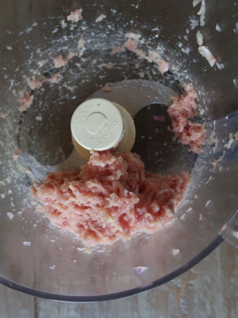 If I have time, I'll grind the chicken up myself, using all boneless thigh or mixing it with breast, usually in a 2:1 ratio of dark to white meat. How to grind chicken at home? I cut the boneless skinless meat into pieces that are about ½-inch big, or a tad smaller. Then I refrigerate the chicken until the pieces are firm, say one hour or longer if I've prepped the meat way in advance. In a pinch, I freeze the meat for about 20 minutes.