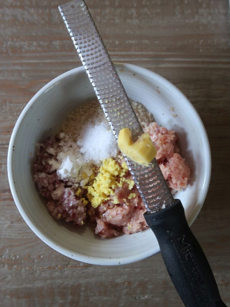 If you don't have chicken, by all means, use ground turkey thigh. There's a fair amount of ginger the meatball mixture to counter an overly turkey taste. Use a chubby knob of 1-inch ginger. I'm lazy so I grate the ginger with a microplane right into the bowl with the other ingredients.