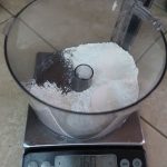 - Place the work bowl of the food processor on the scale, set the scale to zero, and weigh the flour into the bowl. Weigh in the butter and cream cheese and add the salt. Move the bowl to the food processor base, insert the metal blade, cover, and use the Pulse function to cut the flour, butter, and cream cheese into flour-covered pea-sized pieces, about 15 quick pulses. Add the ice water all at once and process until the dough almost comes together in a ball. All the flour will be dampened and the dough will clump.