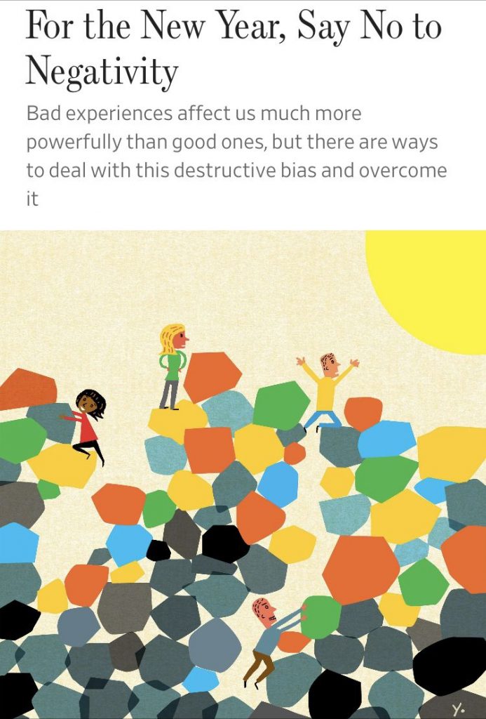 An article in the Wall Street Journal (WSJ) spotlighted the power of negative thinking and how that creates a sense of hopelessness and helplessness. Negative situations impact us more than positive situations so it skews our thinking. Researchers labeled it negativity bias and if we combat it, we’ll have more balanced lives.Â